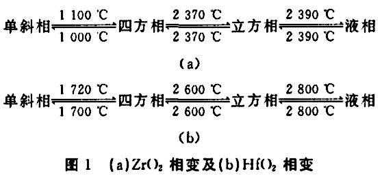 關(guān)于相變增韌的研究主要是圍繞ZrO2的相變特性展開的,是通過控制燒結(jié)工藝使內(nèi)部的微觀組織產(chǎn)生增韌相,消耗裂紋擴(kuò)展所需能量的同時(shí)造成相變體積膨脹促使其它裂紋閉合,是一種自增韌過程。以ZrO2和HfO2為例,隨溫度變化會(huì)發(fā)生以下同素異構(gòu)轉(zhuǎn)變: